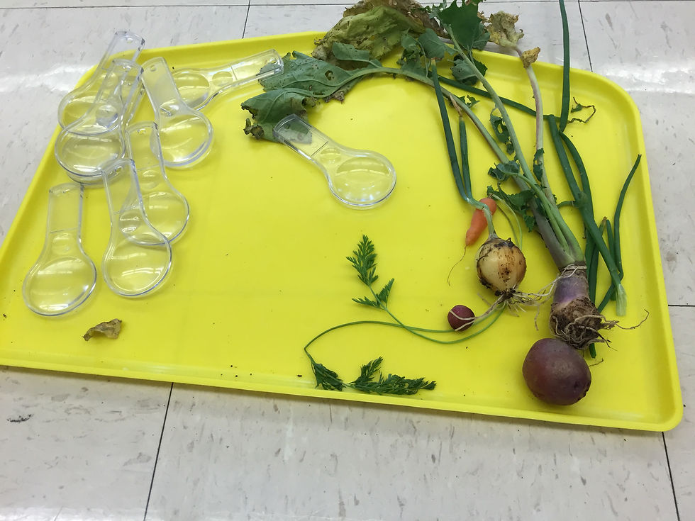 Today we used our senses to become vegetable detectives. We had a lot of fun examining the vegetables from our garden. We made a connection between the taste of food fresh from the garden versus what we eat from the grocery store. Fresh is best and tastes a whole lot better!!